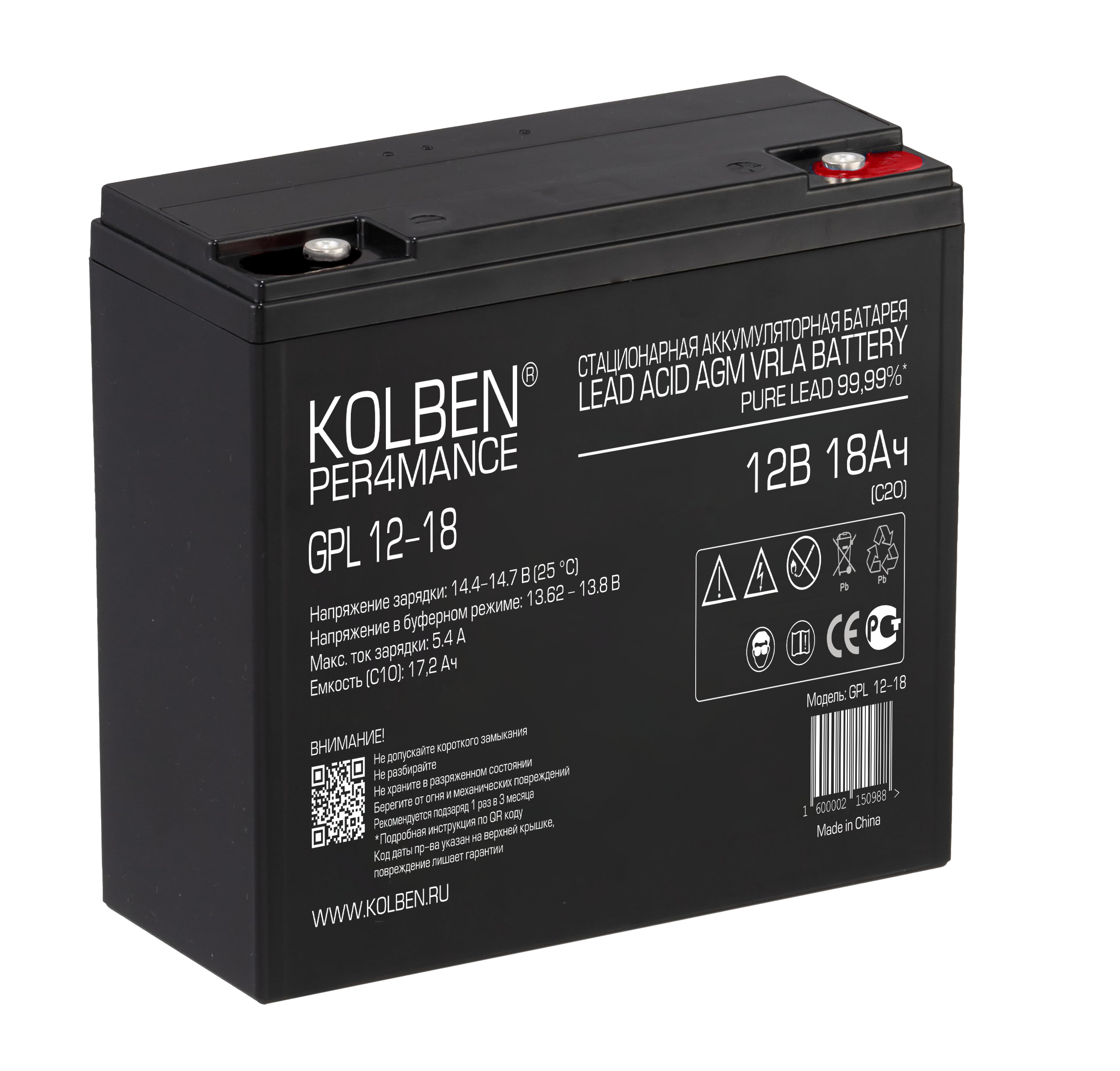 Аккумулятор KOLBEN PER4MANCE GPL 12-18 12В 18Ач 181x76x170 мм